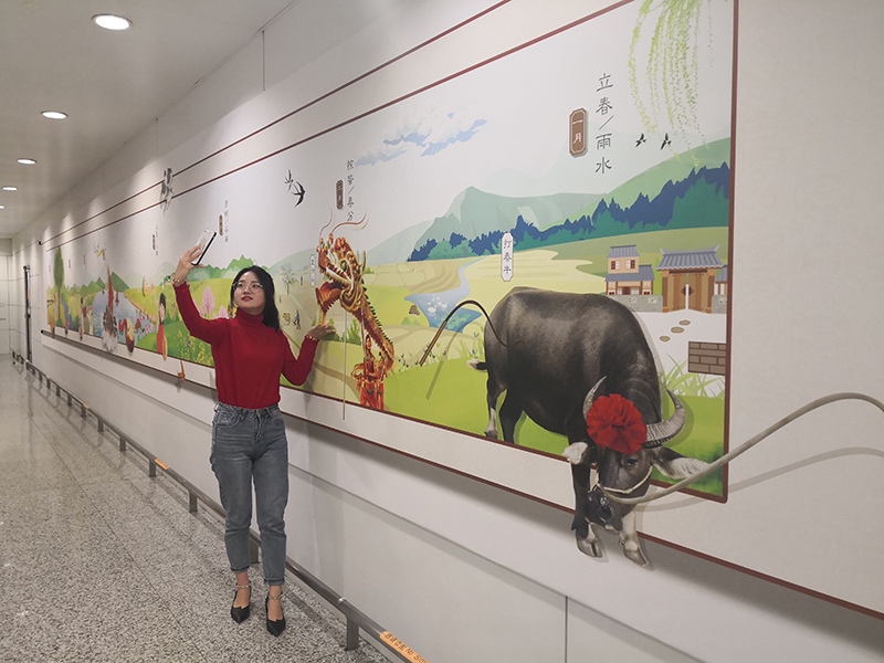 11月1日上午,航站樓首個3D立體藝術墻亮相T3航站樓出發層廁所通道。航站區中心在BW3007廁所通道以人類非物質文化遺產——24節氣為主題,通過3D藝術手法栩栩如生地再現了賽龍舟、打春牛、植樹等民俗風情,打造了本場首個兼顧觀賞性、文化底蘊和互動體驗的3D立體藝術墻,也是今年“廁所革命”文化新舉措,引來了不少旅客合影留念。 (王源斌、任嘉婷)