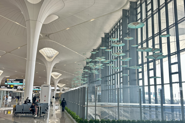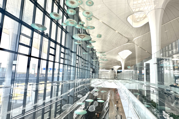 與傳統(tǒng)大型空間藝術(shù)展陳裝置不同的是,“煙雨江南”裝置不僅彰顯了地域文化風(fēng)采,同時(shí)還具備空防安全的效用。自T4投運(yùn)以來,25號(hào)門兩側(cè)、T4國(guó)內(nèi)行李提取通道上空,因空間屬性特殊,存在一定的安全隱患。在民航浙江監(jiān)管局空防處多次現(xiàn)場(chǎng)調(diào)研和寶貴建議下,航站區(qū)中心立足區(qū)域管理中心職責(zé),主動(dòng)作為、立題設(shè)項(xiàng),組織多場(chǎng)內(nèi)部研討,提出了建造兼具安全、美觀功能性裝置的破題思路,在管控空防安全隱患、減少安保人員配置的同時(shí),持續(xù)賦能T4文化屬性。