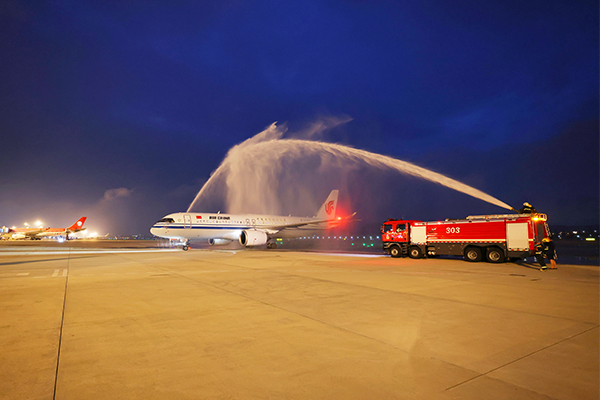 9月11日,杭州機(jī)場迎來首個國產(chǎn)大飛機(jī)C919執(zhí)飛的商業(yè)載客航班,公司黨委副書記邵勇敏出席儀式現(xiàn)場。18:32,從北京飛抵杭州的CA1722航班搭載150名旅客,緩緩穿過“水門”,滑入410機(jī)位。
