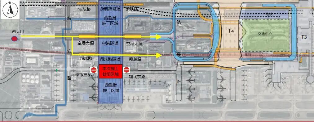 翔飛路封閉施工斷流后,原行經翔飛路的各類車輛,需提前調整出行路線,可選擇空港大道和翔越路通行。